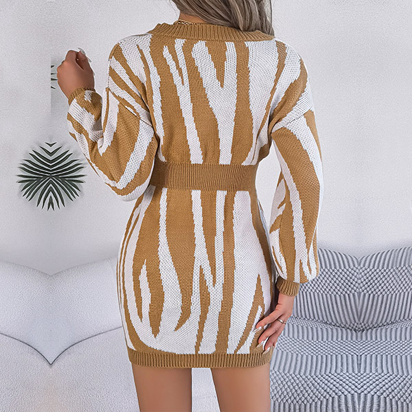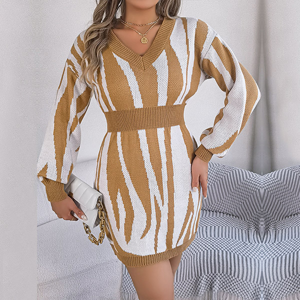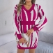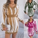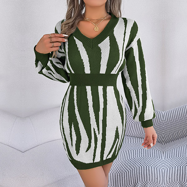 Fashion Contrast Color V-neck Long Sleeve Knitted Dress