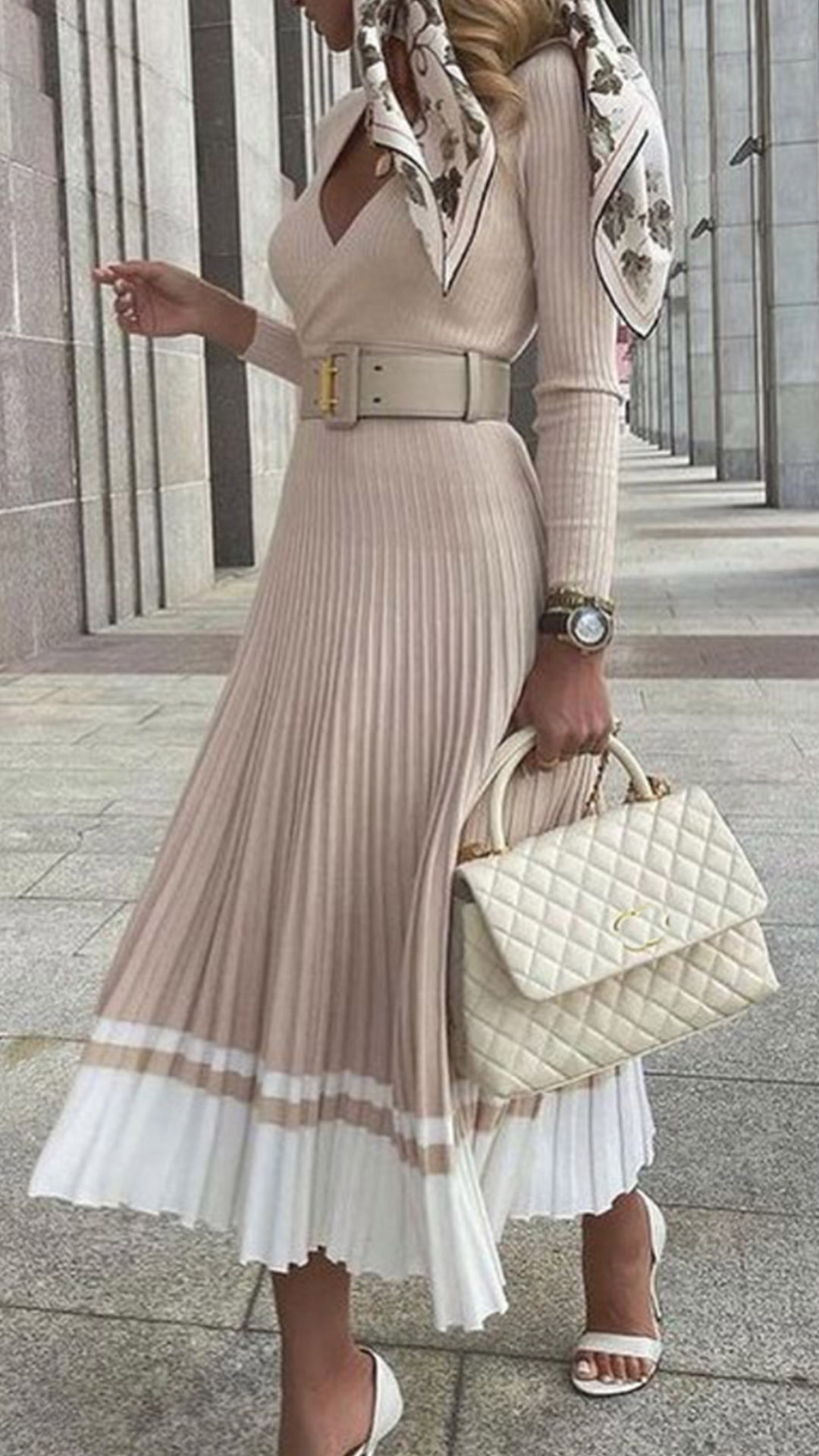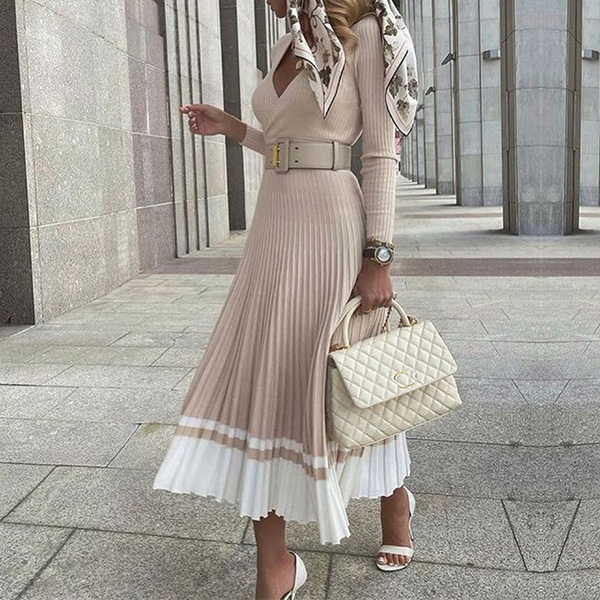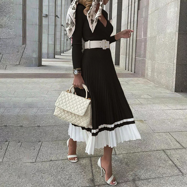 Fashion Contrast Color V-neck Long Sleeve Pleated Midi-dress (without Belt)