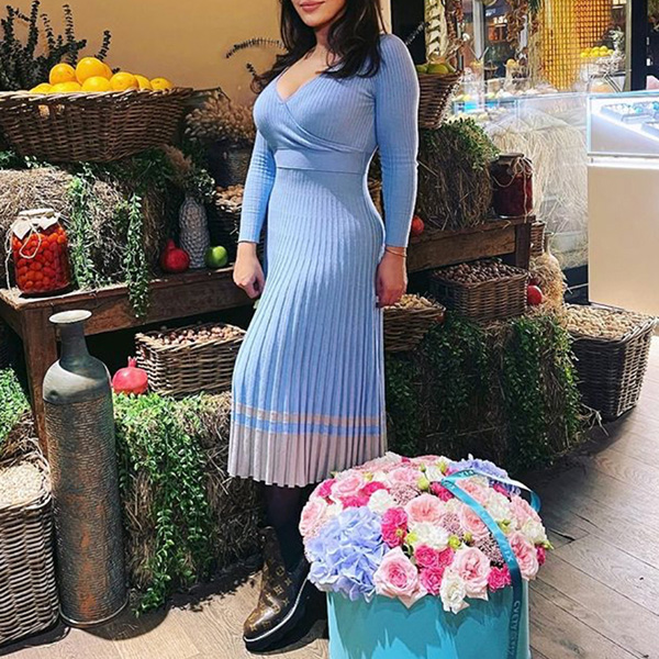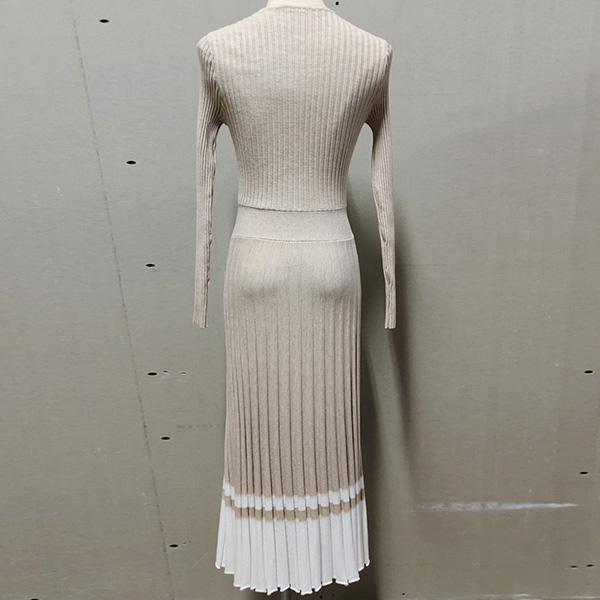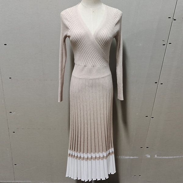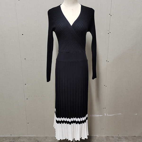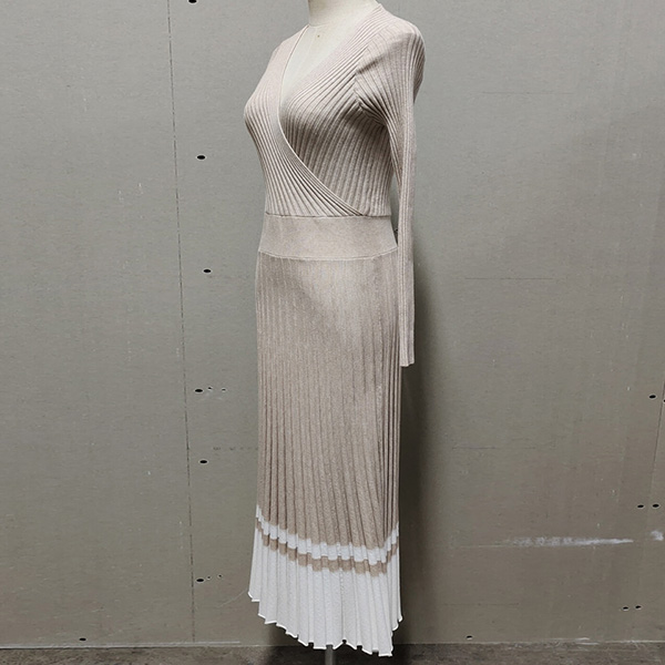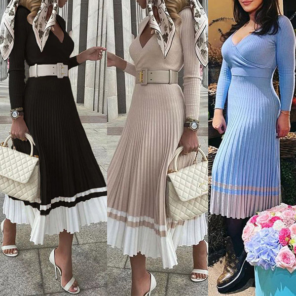 This Pleated Midi-dress is the perfect combination of chic and modern style. The unique v-neck design and contrast color hemline scheme create a bold and eye-catching look. The pleated midi-length skirt adds a touch of femininity and sophistication, while the long sleeves keep you warm and cozy. This dress is perfect for the fashionista who wants to make a statement without sacrificing comfort.