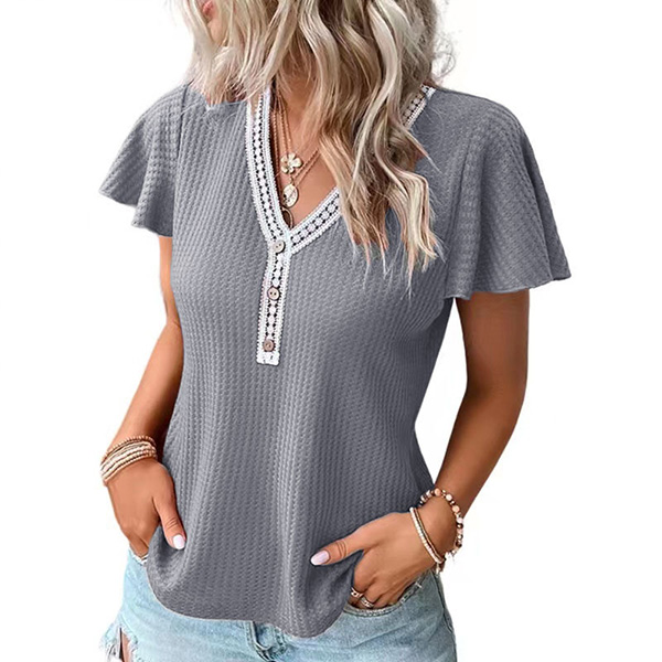I like this casual shirt! The contrast color V-neck and ruffled short sleeves add a touch of elegance and sophistication, wanna have a try?