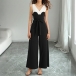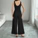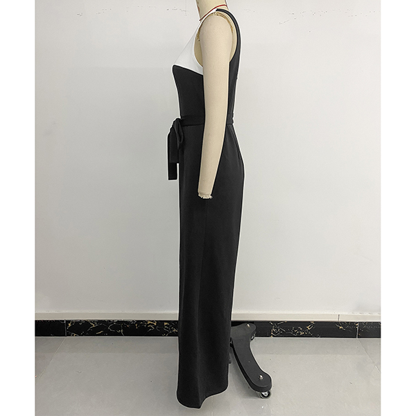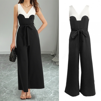 Fashion Contrast Color V-neck Sleeveless Straight-cut Self-tie Jumpsuit