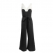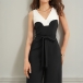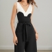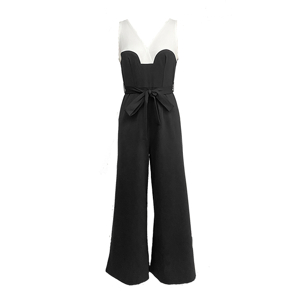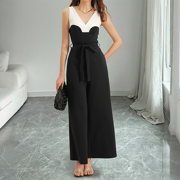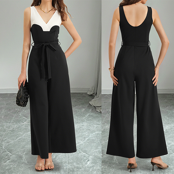This elegant jumpsuit features striking contrast color styling with elegant V-neck construction and streamlined straight-cut design for contemporary modern elegance. The self-tie detailing ensures adjustable customization with feminine charm that showcases the beautiful balance between contrast color bold refinement and V-neck graceful elegance. Perfect for daily wear.