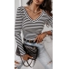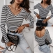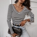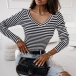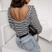 Fashion Contrast Color White and Black Stripe Printed V-neck Long Sleeve Backless Shirt