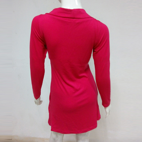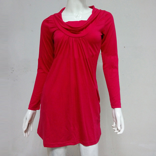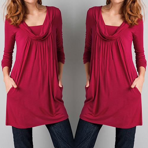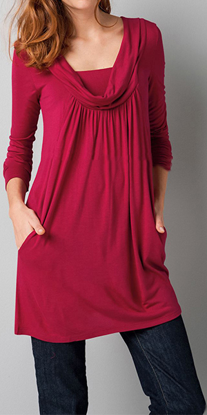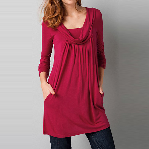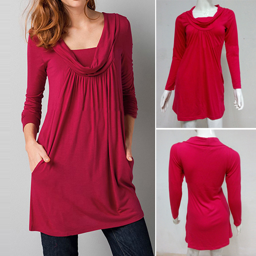 A long-sleeved dress features cowl neckline and crinkle in front under the neck.