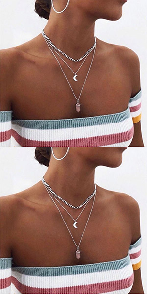 This three-layer style necklace is decorated with crescent and bullet pendant,which make it look so chic and unique. When wearing some off-shoulder or strapless outfits,adding this necklace would make you look more beautiful!