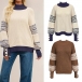Fashion Crew Neck Batwing Long Sleeve Contrast Color Printed Knitted Sweater