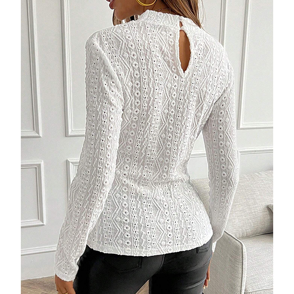 This white shirt features classic crew neck styling with shoulder button for decoration and striking hollow out detailing for modern sophisticated elegance. Wanna have a try?