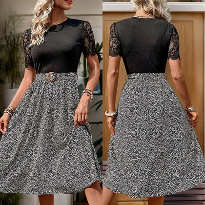 This trendy and chic dress features a crew neck, lace splicing detail along the short sleeve, and black bodice spliced with printed skirt, creating a unique and trendy look that is perfect for making a fashion statement. Wanna have a try?