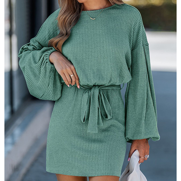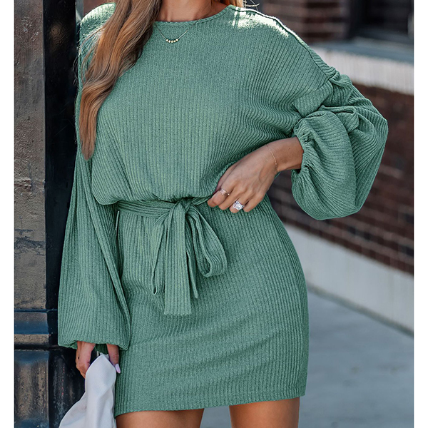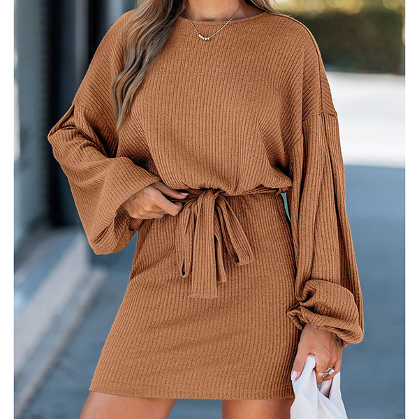 Embrace romantic silhouette meets modern comfort in this beautifully designed ribbed dress. Eye-catching lantern sleeves create dramatic volume and vintage-inspired charm, adding a statement-making element to this otherwise streamlined piece. A self-tie detail allows you to cinch your waist and create a customized, figure-flattering fit that accentuates your silhouette. Perfect for daily wear .