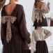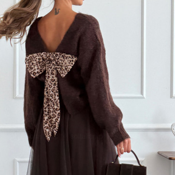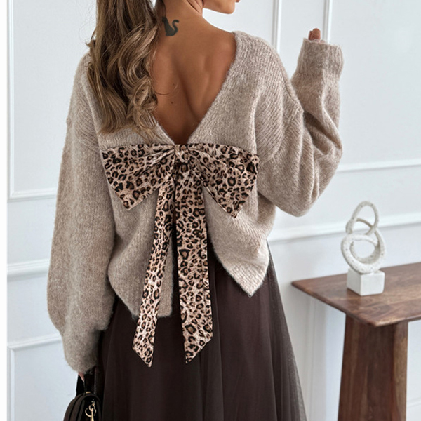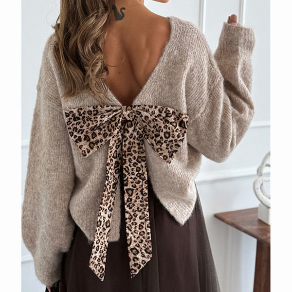 Fashion Crew Neck Long Sleeve Backless Leopard Bowknot Sweater