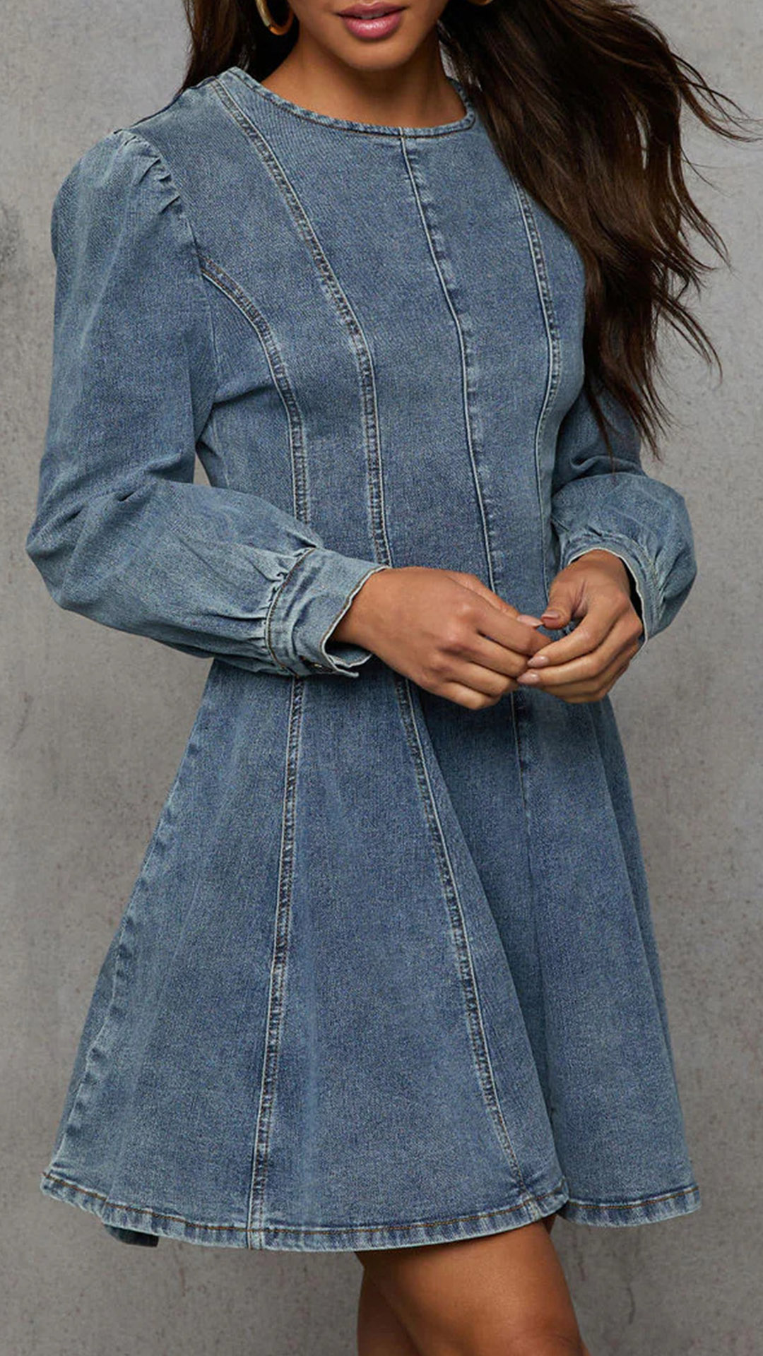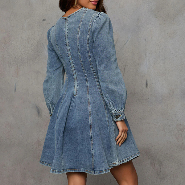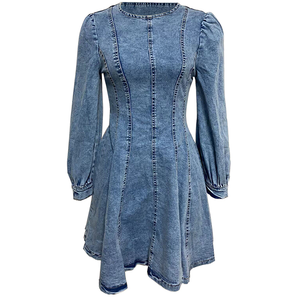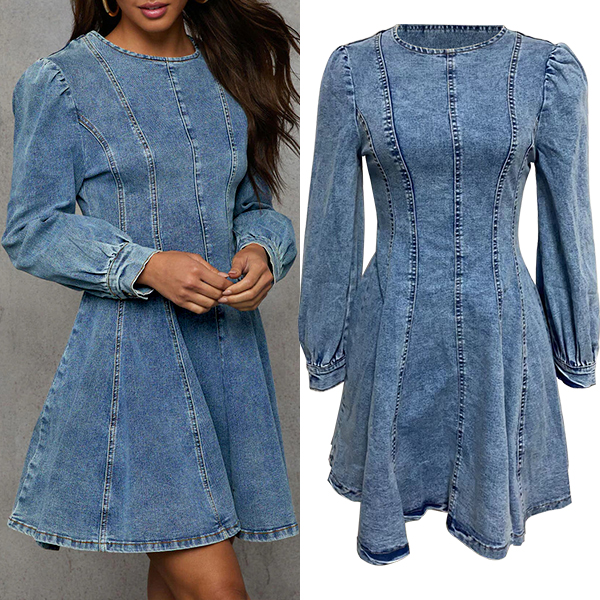 Elevate your fashion game with this Denim Mini Dress. This trendy denim dress features a classic crew neckline and long sleeves for a chic and sophisticated look. The cinched waist creates a flattering silhouette, accentuating your curves in all the right places. The old-washed denim gives the dress a vintage and edgy feel, perfect for adding a touch of urban cool to your outfit. The mini length is on-trend and versatile, making this dress a stylish choice for any occasion. Pair it with boots or sneakers for a casual daytime look.