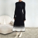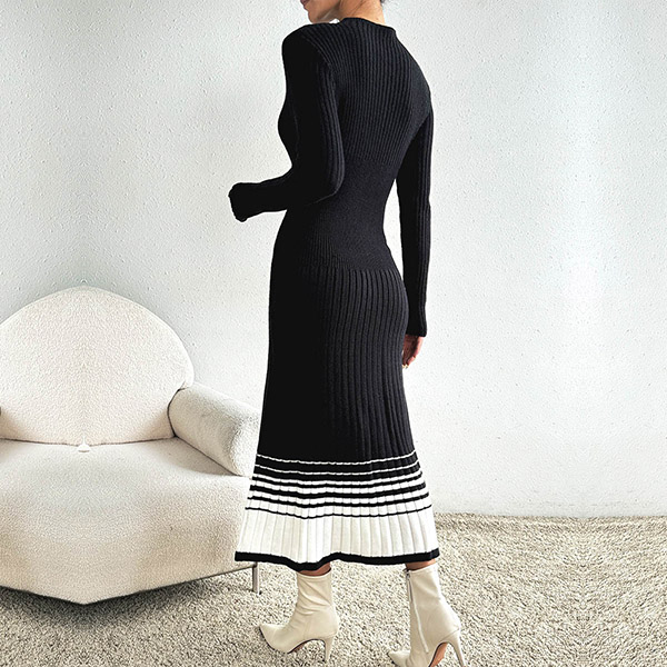Fashion Crew Neck Long Sleeve Contrast Color Stripe Printed Hemline Bodycon Ribbed Dress