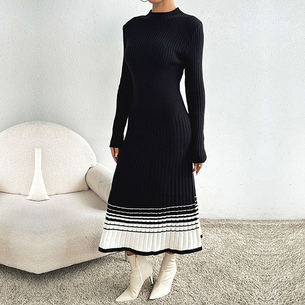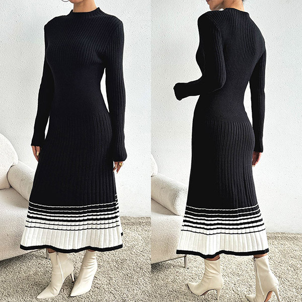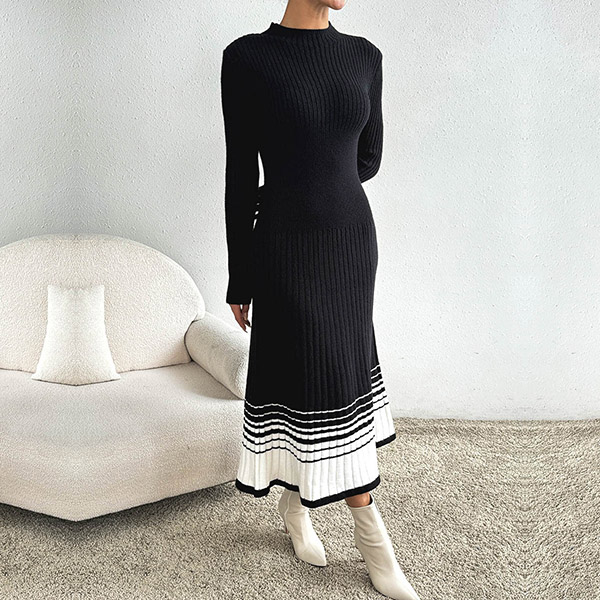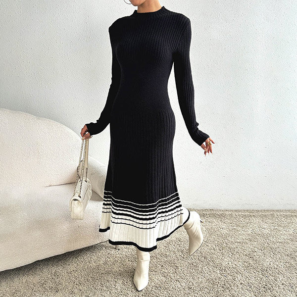 Make a statement with this Ribbed Dress. This stylish dress features a classic crew neck design and long sleeves for a chic and sophisticated look. The contrast color stripe printed along the hemline adds a pop of color and visual interest, creating a trendy and eye-catching detail. Pair it with heels or ankle boots for a stylish outfit that can easily transition from day to night.