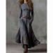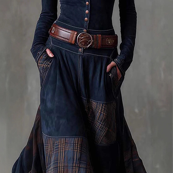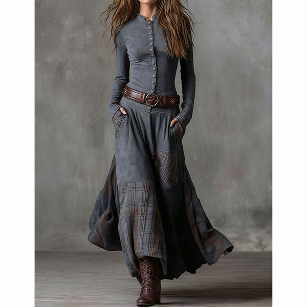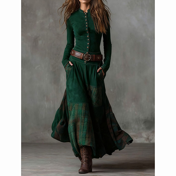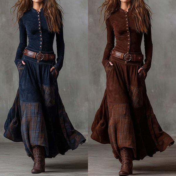 Fashion Crew Neck Long Sleeve Front Button Plaid Spliced Maxi Dress