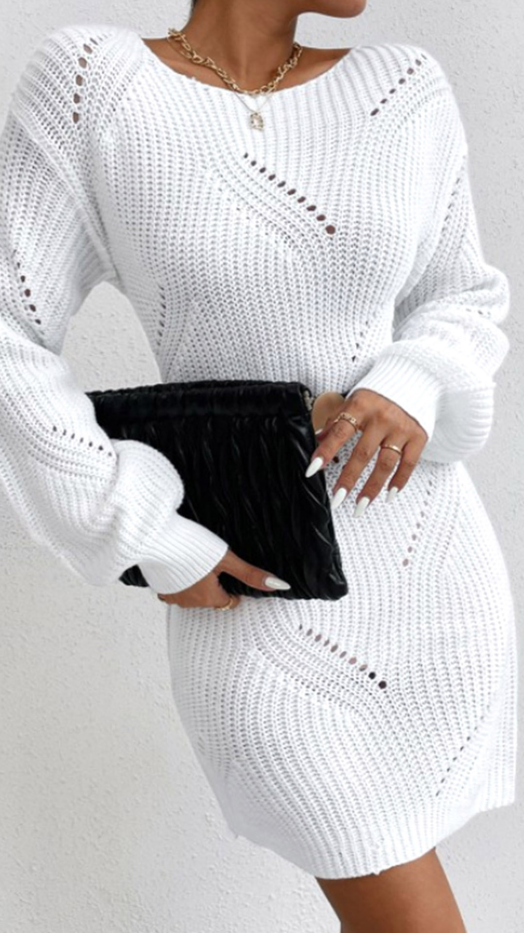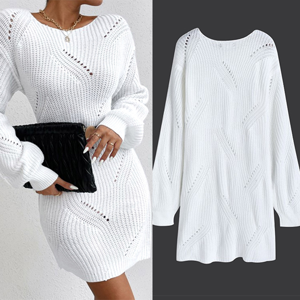 Step out in style with this Sweater Dress. This trendy dress features a chic crew neckline and long sleeves for a classic and sophisticated look. The hollow out detailing adds chic element. The sweater dress design is cozy and comfortable, making it ideal for the cooler seasons. Pair it with heels or boots for a fashionable and stylish ensemble.