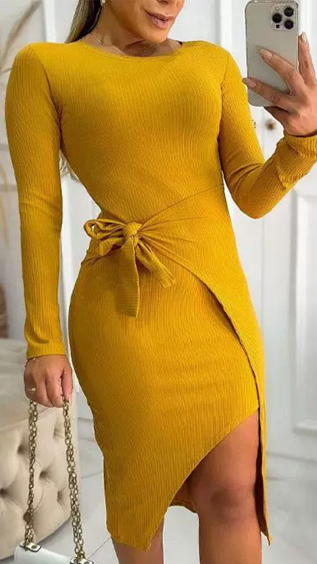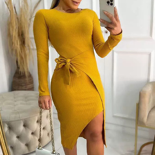 Fashion Crew Neck Long Sleeve Irregular Hemline Bodycon Ribbed Wrap Dress