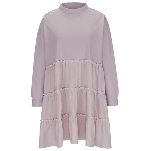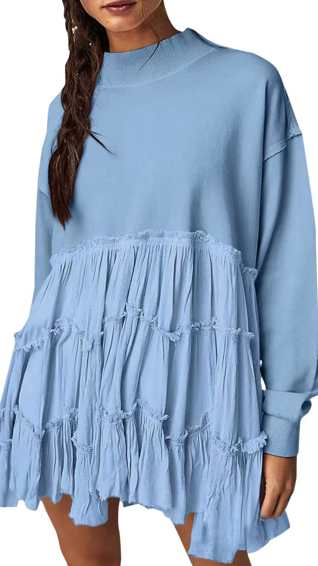 This fashionable sweatshirt features a crew neck, long sleeves, and pleated tiered hemline design, creating a stylish and trendy look. Multi-colors available.