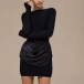 This sophisticated dress features classic crew neck styling with flattering ruched detailing and figure-enhancing bodycon silhouette for contemporary streamlined elegance. Pair with heels and statement jewelry for sophisticated contemporary appeal.