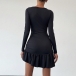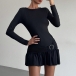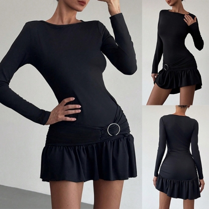 Fashion Crew Neck Long Sleeve Ruched Buckle Ruffle Hemline Bodycon Dress