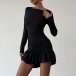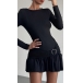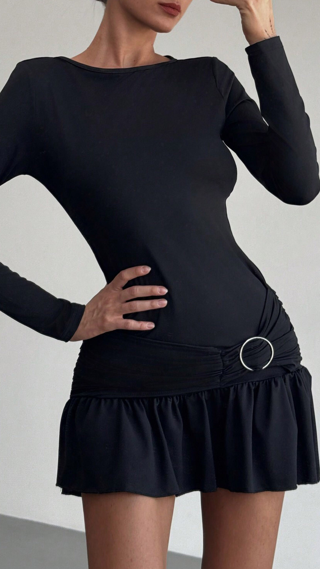 This black dress features ruched detailing with a buckle accent adds a chic and contemporary touch to the dress. While the ruffle hemline adds a playful and flirty element, adding movement and texture to the dress. Wanna have a try?