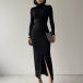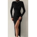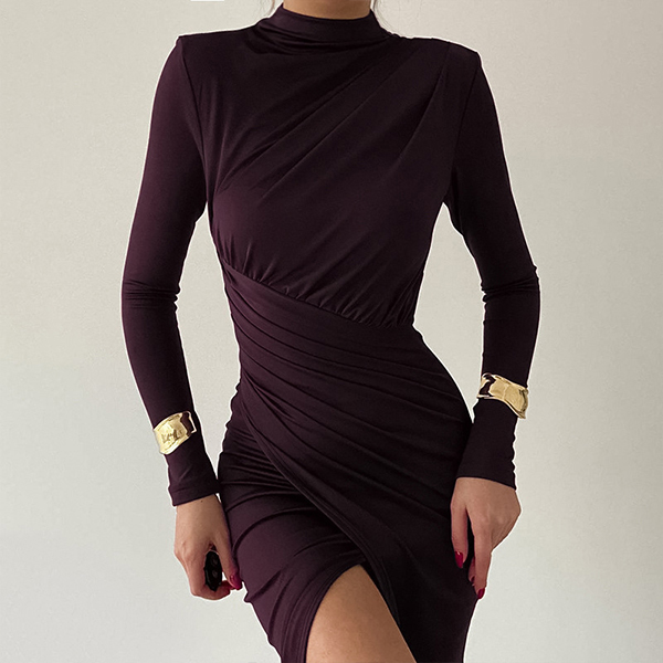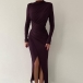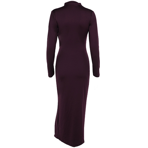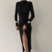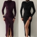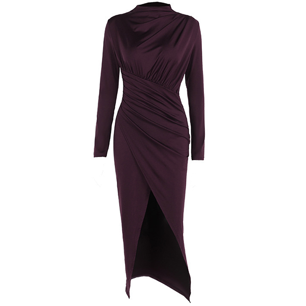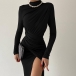 Fashion Crew Neck Long Sleeve Ruched Front Slit Maxi Bodycon Dress