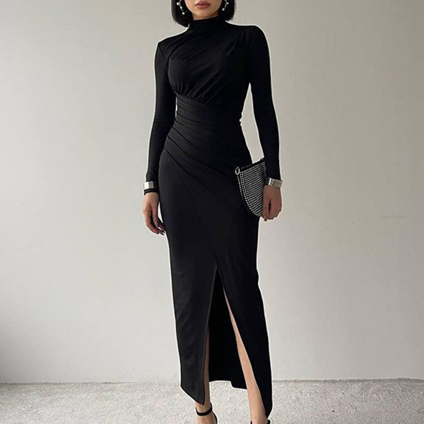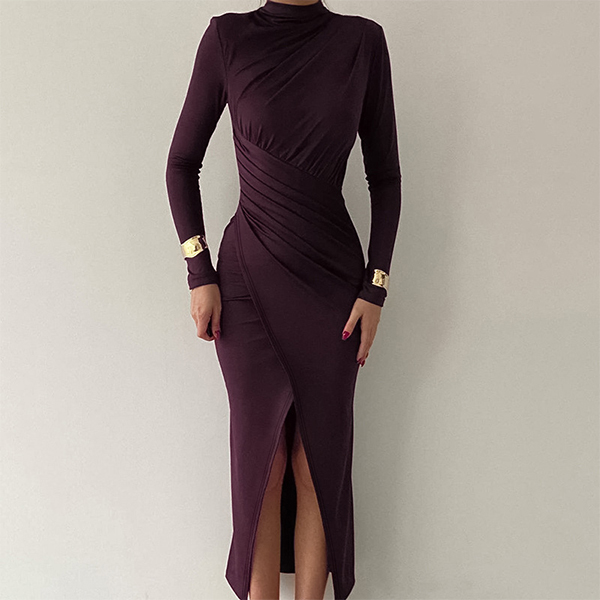 Elevate your look with this Maxi Bodycon Dress. This sophisticated dress features a crew neck and long sleeves for a chic and elegant look. The ruched detailing on the front adds texture and visual interest, while the front slit adds a touch of allure and allows for ease of movement. Perfect for a special occasion, cocktail party, or evening event, this maxi bodycon dress is sure to make a statement.