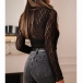 This black shirt features classic crew neck styling with alluring semi-through mesh-net construction and complete long sleeve coverage for modern sophisticated elegance. Pair with fitted camisoles underneath and structured bottoms for layered modern appeal.