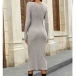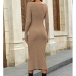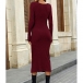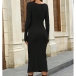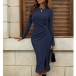 Fashion Crew Neck Long Sleeve Side Knot Ruched Side Slit Ribbed Dress