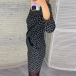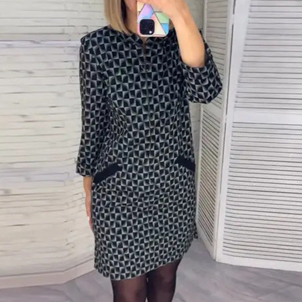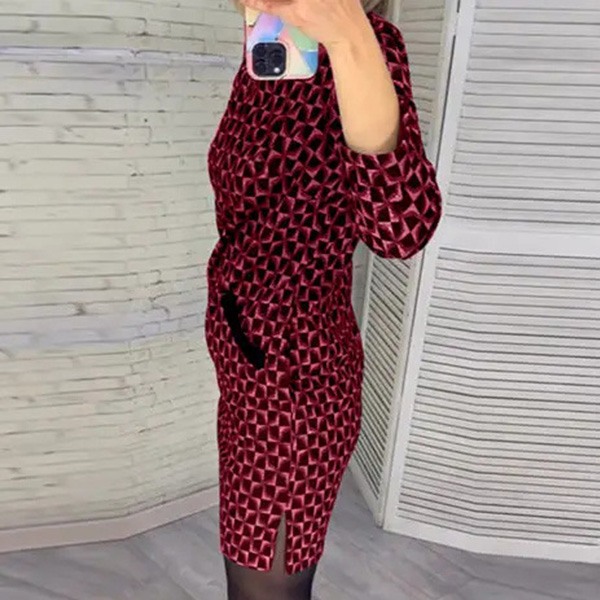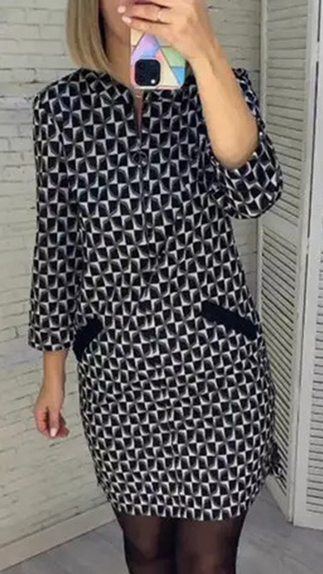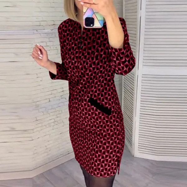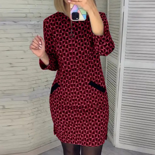 Fashion Crew Neck Long Sleeve Side Pockets Printed Mini Dress