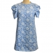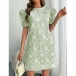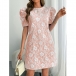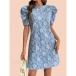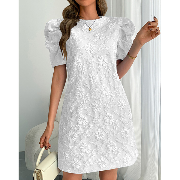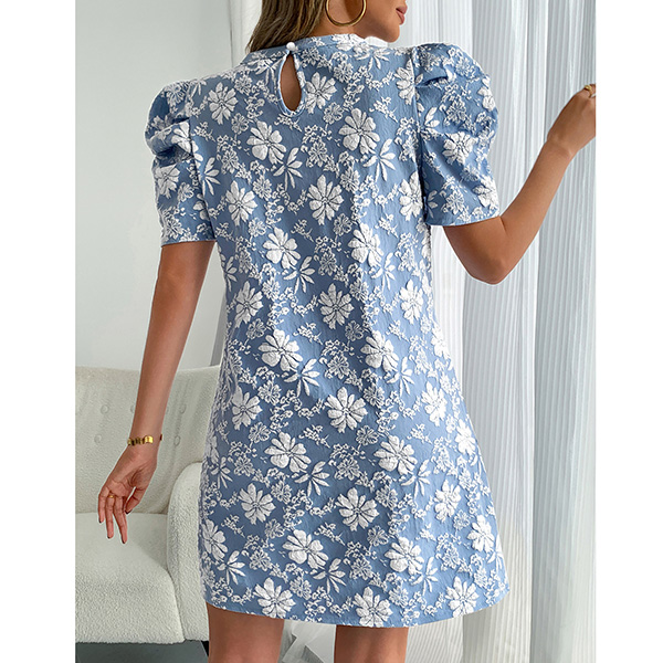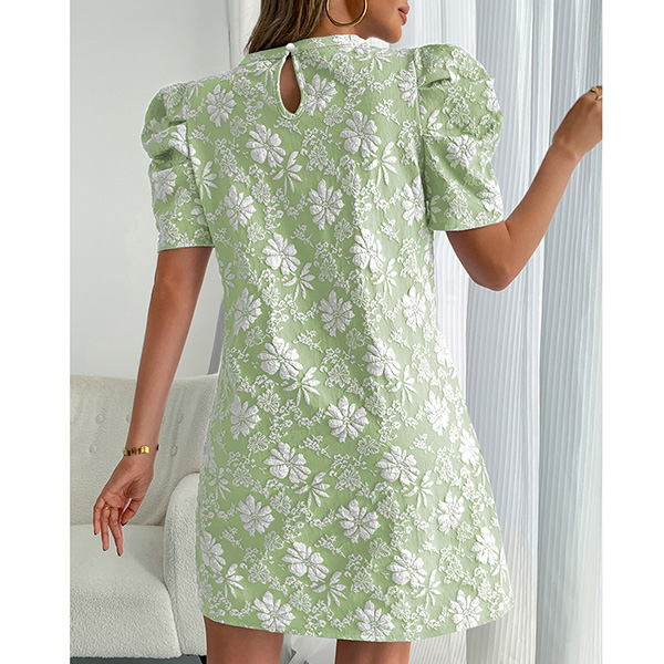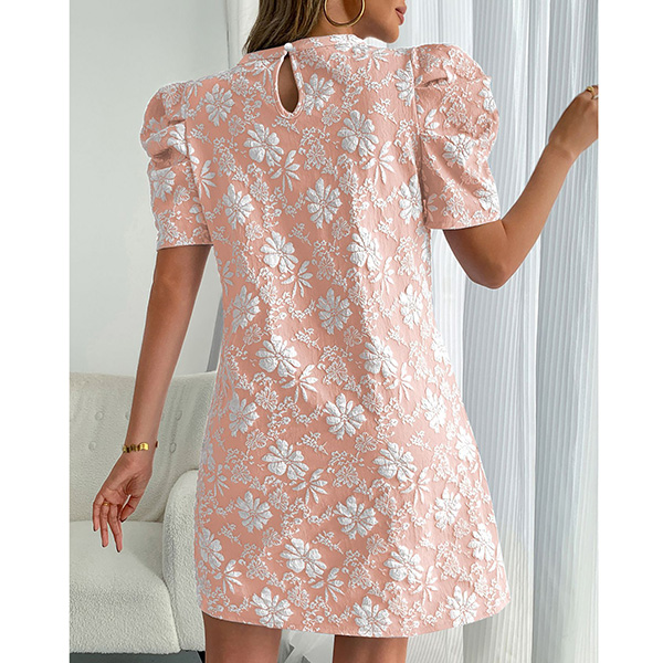 Fashion Crew Neck Puff Short Sleeve Floral Jacquard Mini Dress