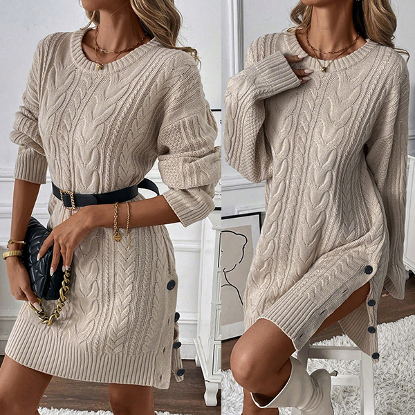 This sweater dress features classic cable knit pattern with side button detailing for timeless elegance. The crew neck brings clean sophistication whilst the side slit with button closure adds functional style and visual interest. Wanna have a try?