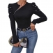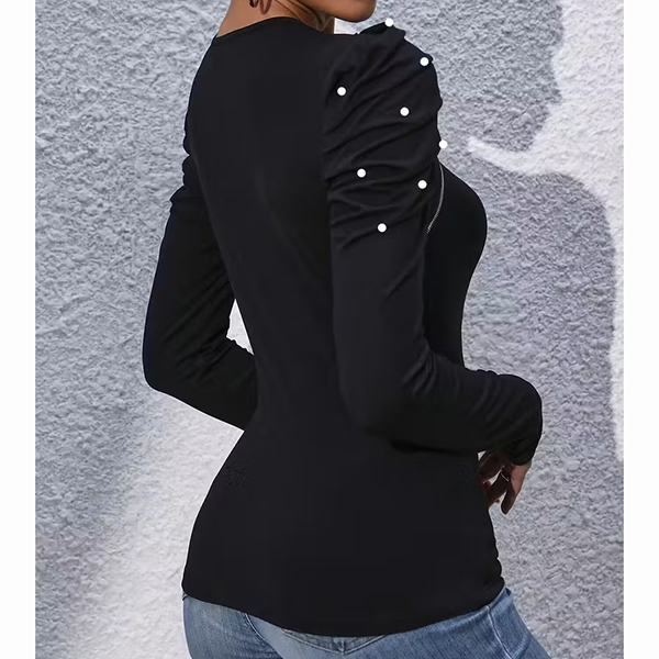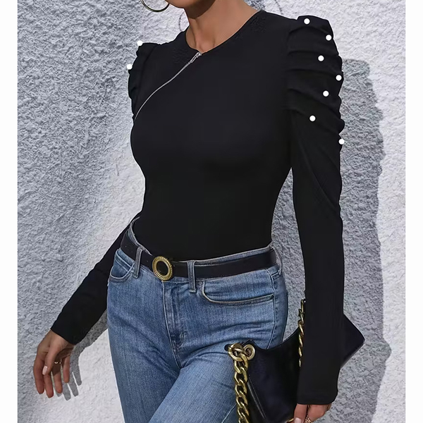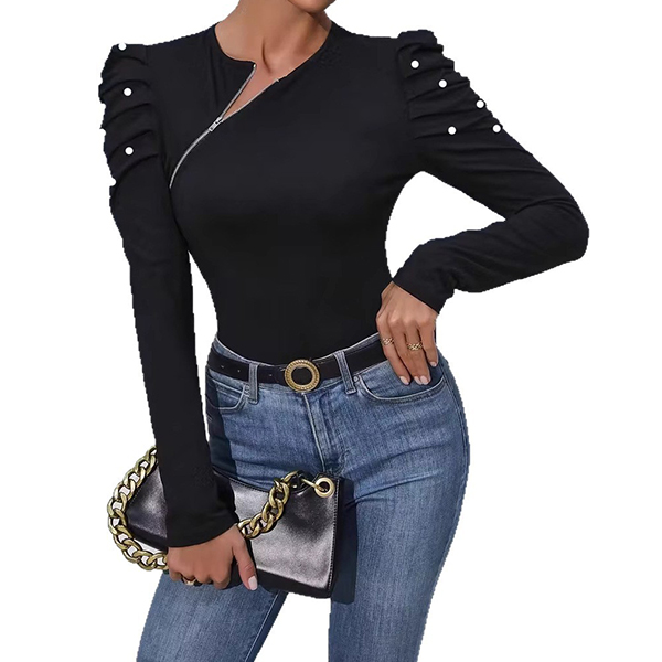 Fashion Crew Neck Slant Zipper Puff Long Sleeve Bead Shirt