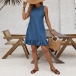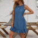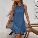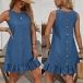 Fashion Crew Neck Sleeveless Back Button Ruffle Hemline Denim Dress