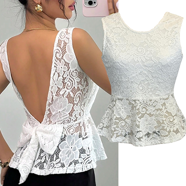Look at this shirt! The backless detail adds a touch of allure and creates a flirty and elegant silhouette. While the bowknot accent on the back adds a playful and romantic touch, enhancing the overall design of the shirt. The lace fabric brings a delicate and feminine feel to the piece, adding a touch of elegance and sophistication. Pair this shirt with high-waisted pants or a skirt to showcase the backless detail and bowknot accent, creating a stylish and chic ensemble.