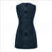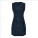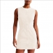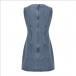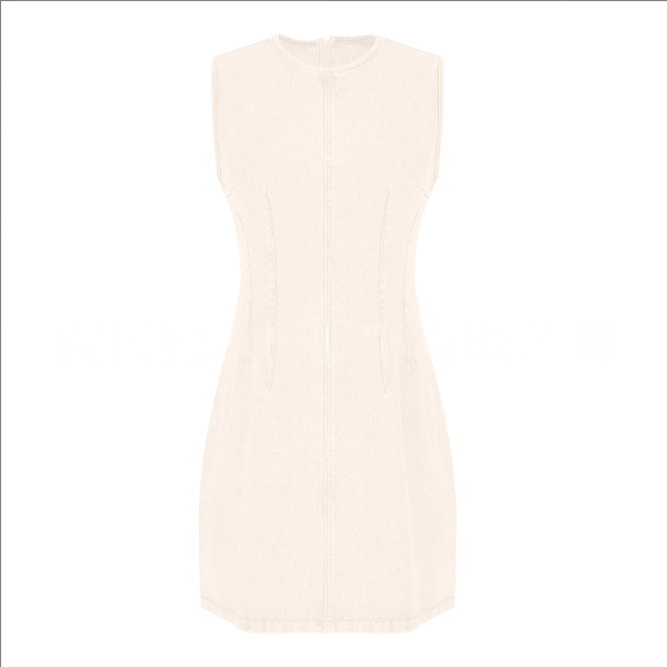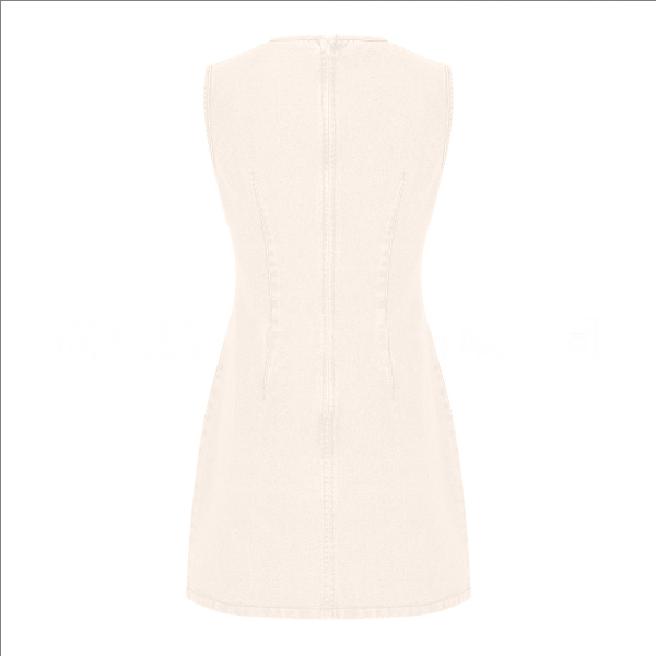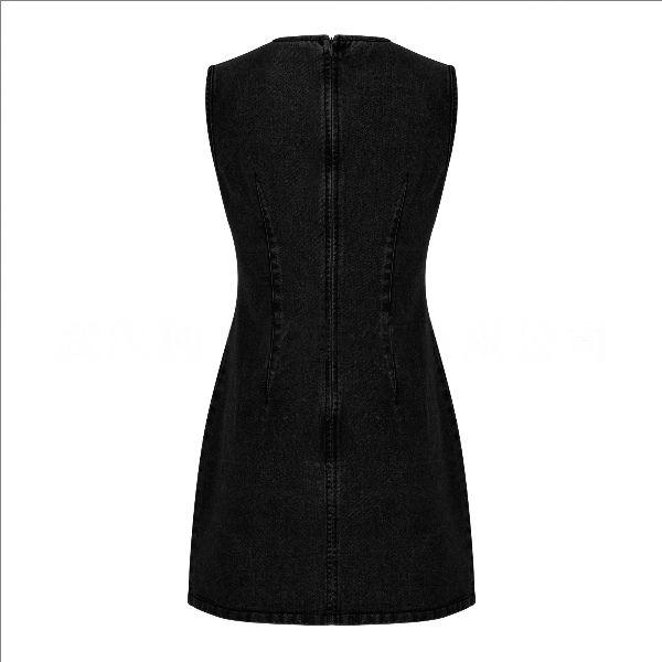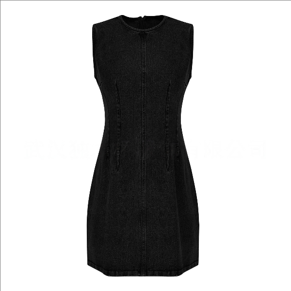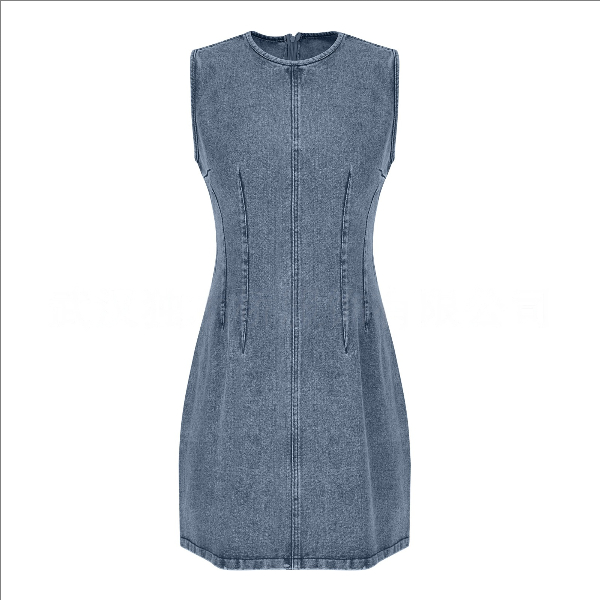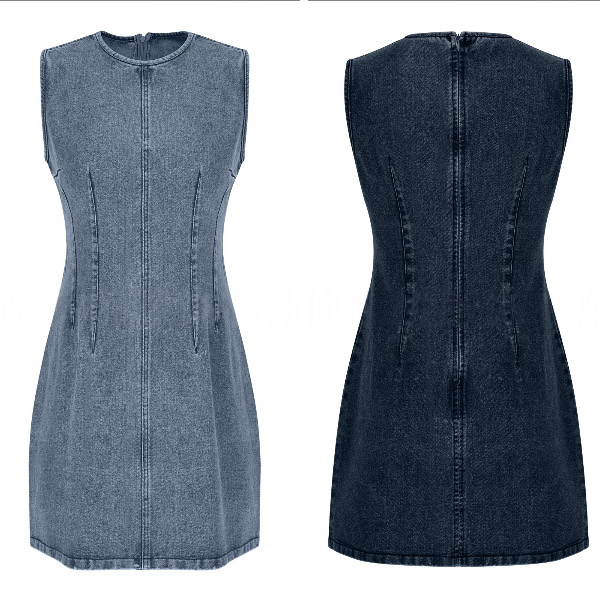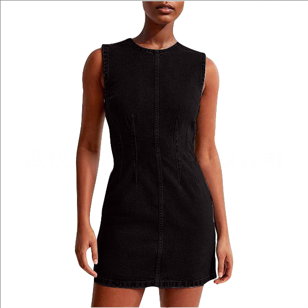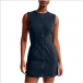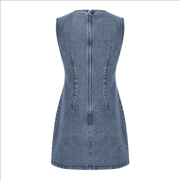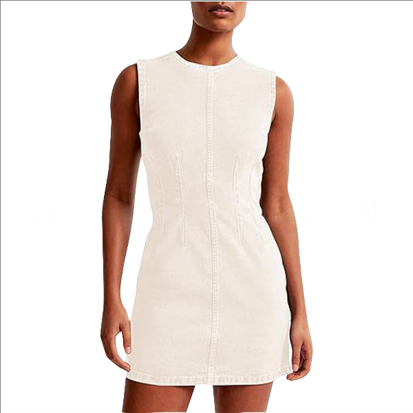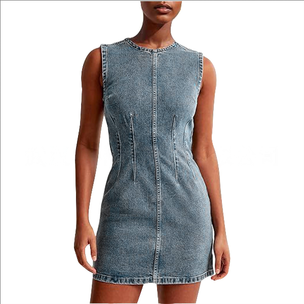 This is a stylish and versatile dress that combines classic denim with modern details. The crew neck and sleeveless design provide a simple and elegant silhouette, while the cinch waist detail adds definition and creates a flattering shape. It is perfect for casual outings or everyday wear.