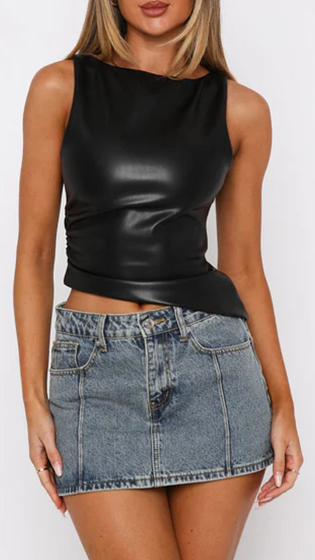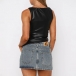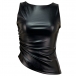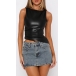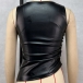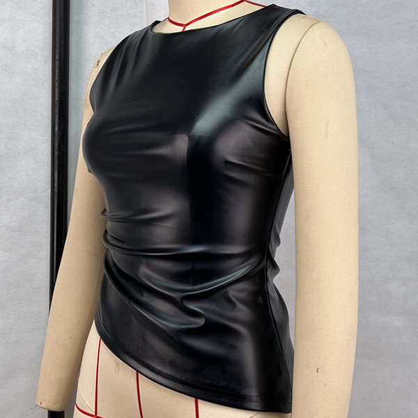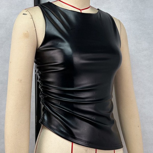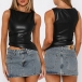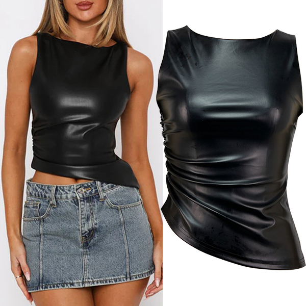 Fashion Crew Neck Sleeveless Irregular Hemline Artificial Leather PU Shirt