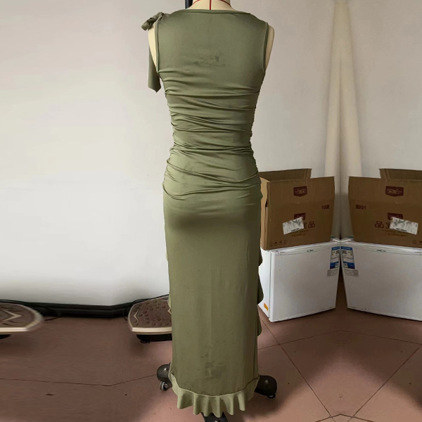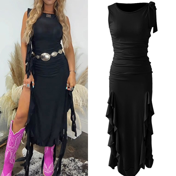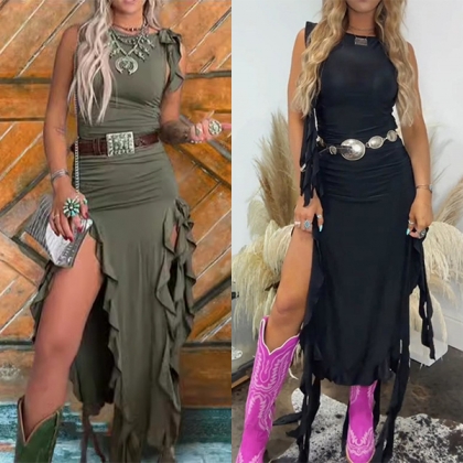 Fashion Crew Neck Sleeveless Ruffle Slit Maxi Dress