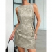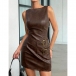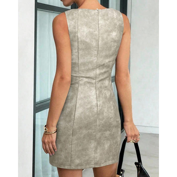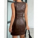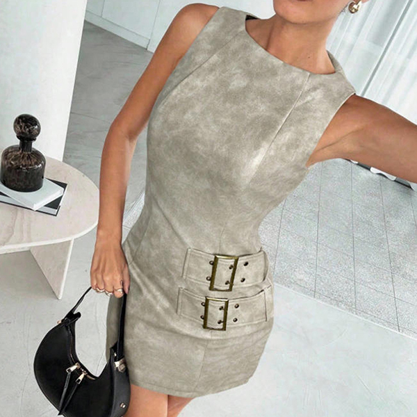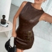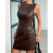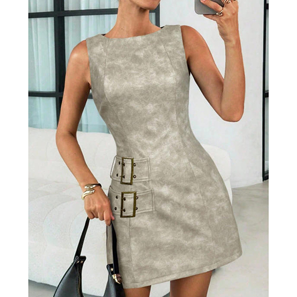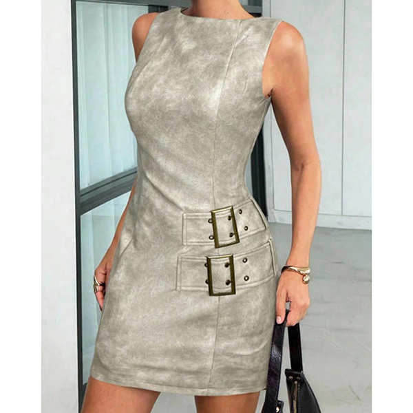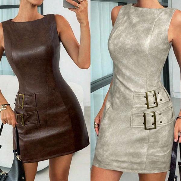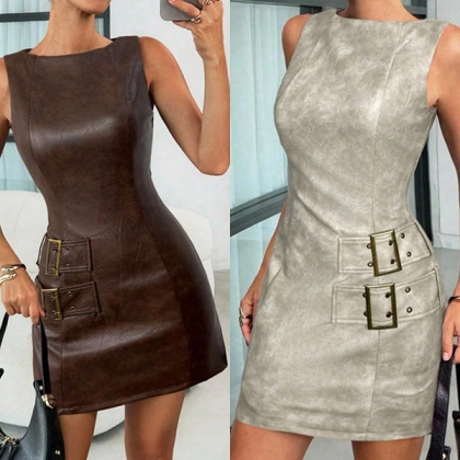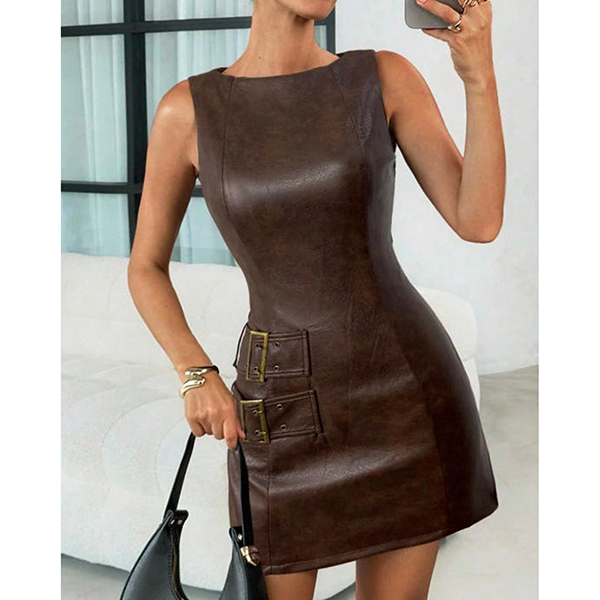 Fashion Crew Neck Sleeveless Side Buckle Artificial Leather PU Bodycon Dress