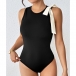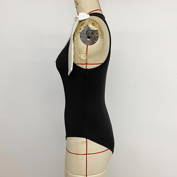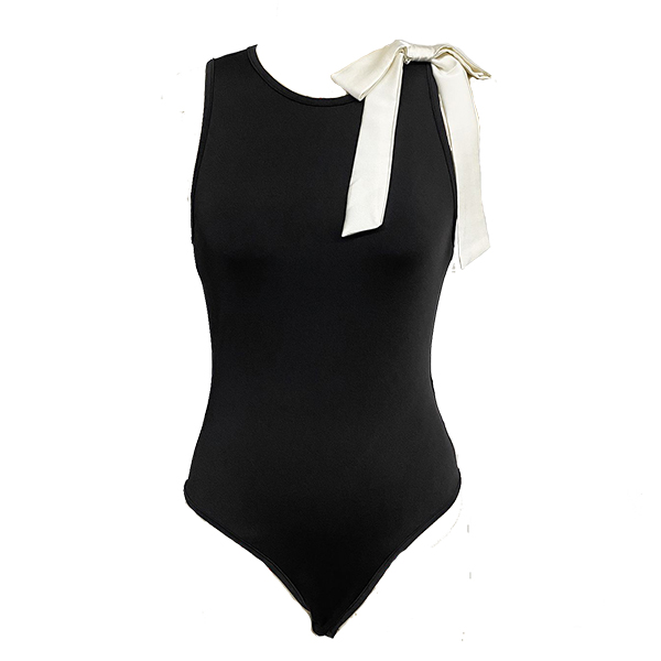 This elegant bodysuit features classic fashion styling with sophisticated crew neck construction and charming white bowknot on shoulder design for contemporary feminine sophistication.