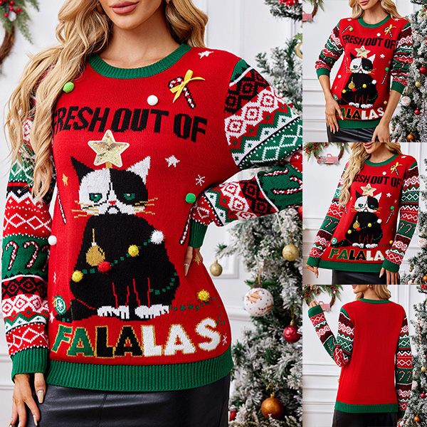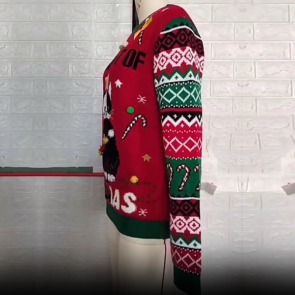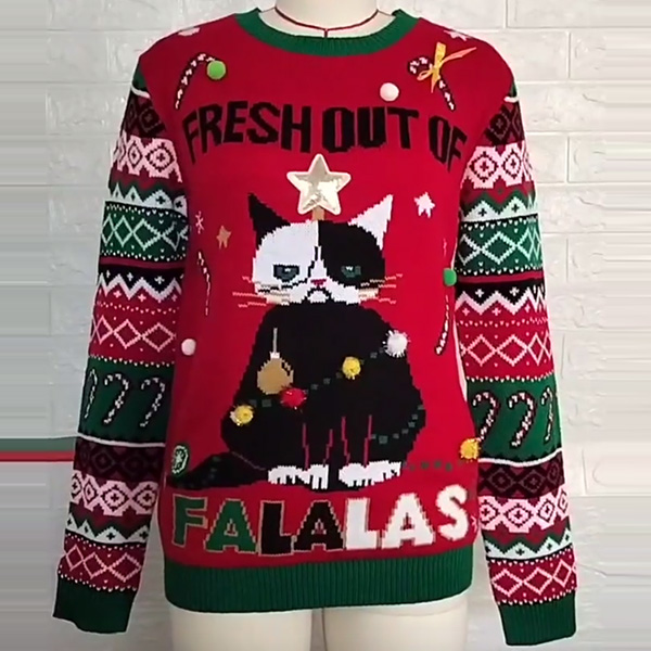 This Christmas sweater can be styled in various ways to suit your holiday style. The cute cartoon cat pattern adds a charming and adorable element to the sweater, making it a perfect choice for Christmas celebrations and gatherings. Pair it with jeans and sneakers for a casual and cozy look.