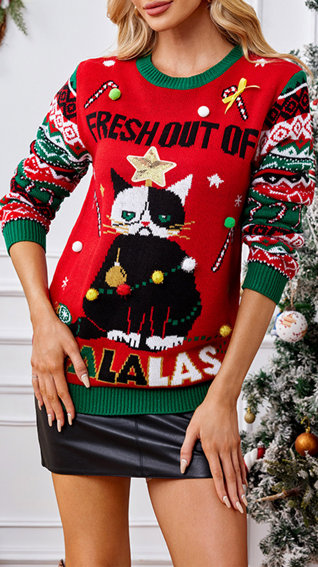 Fashion Cute Cartoon Cat Pattern Crew Neck Long Sleeve Christmas Sweater