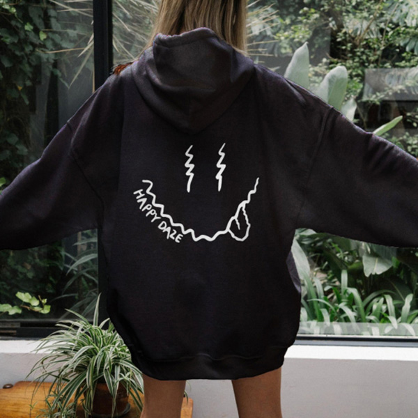 Fashion Cute Face Printed Black Hoodie Sweatshirt