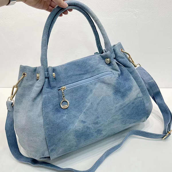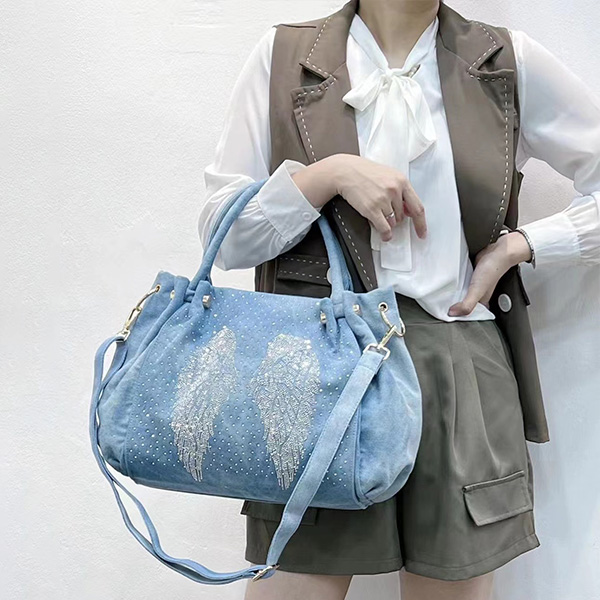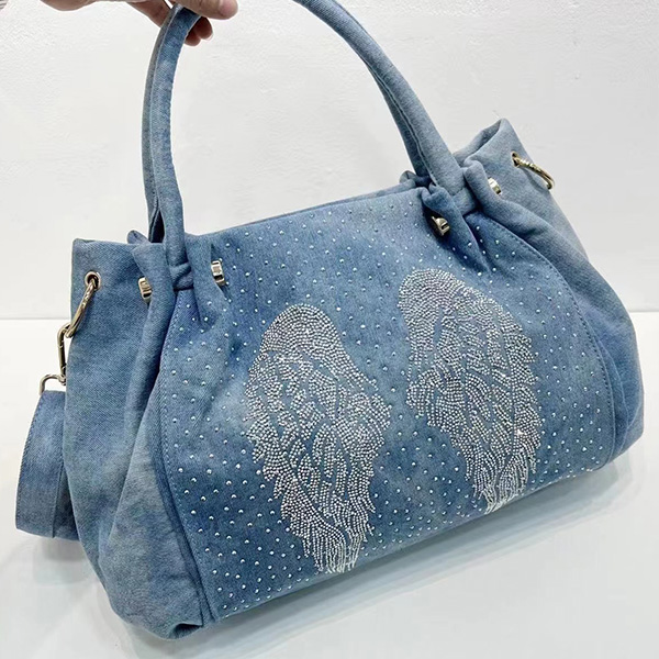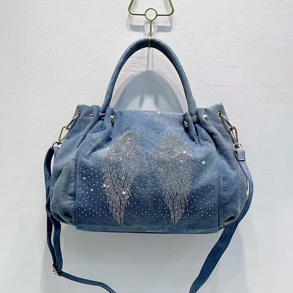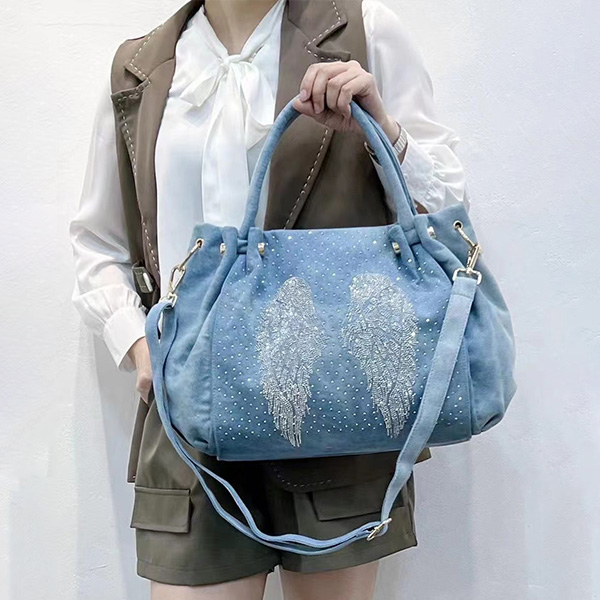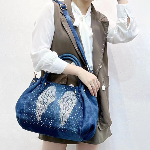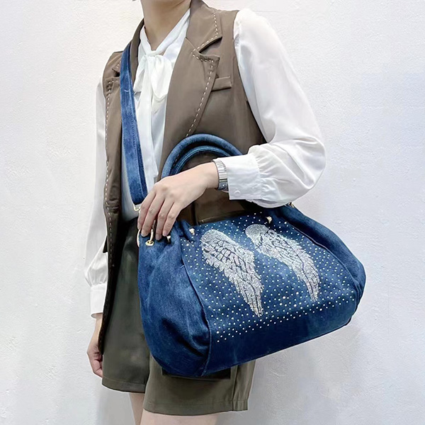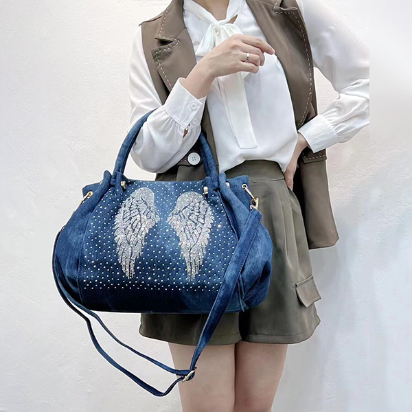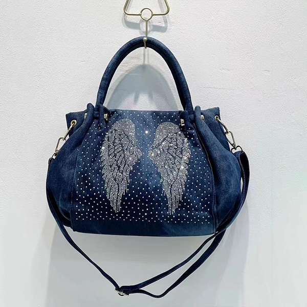 Fashion Denim Messenger Bag with Rhinestone Wing Design
