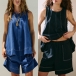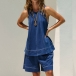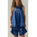 This is a trendy and versatile ensemble that exudes modern flair and effortless cool. The denim fabric adds a touch of edgy sophistication to the set, creating a timeless and classic look that is perfect for any occasion. The sleeveless shirt offers a chic and laid-back style, perfect for warmer days and showcasing your arms and shoulders. The shorts provide a comfortable and stylish bottom that is ideal for staying cool and fashionable in the summer months. Pair it with sneakers or sandals for a casual and relaxed look.