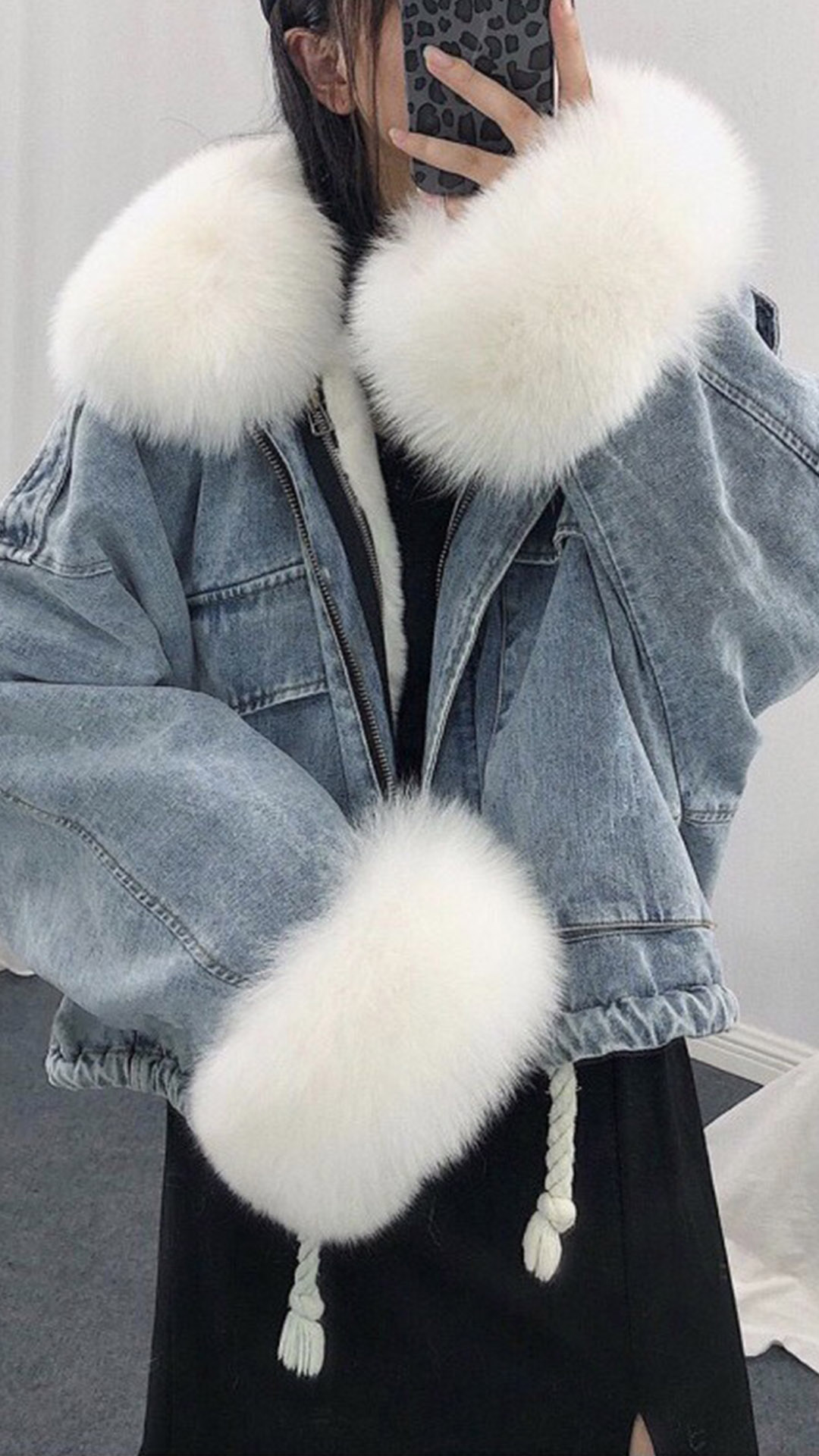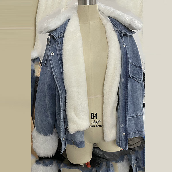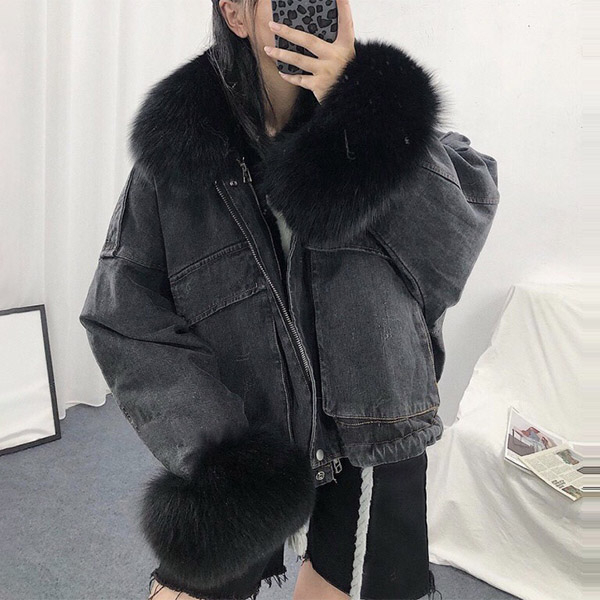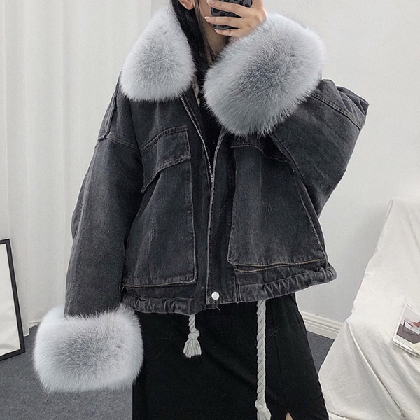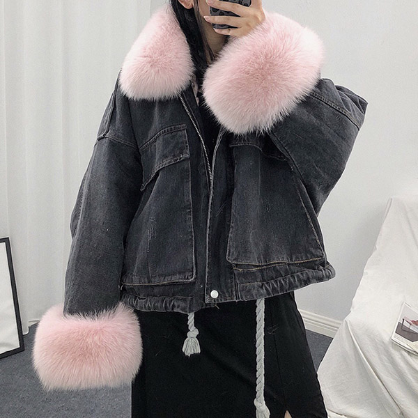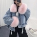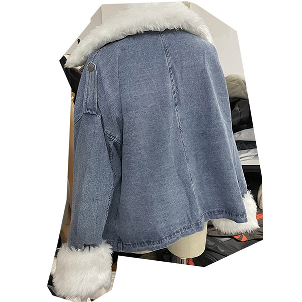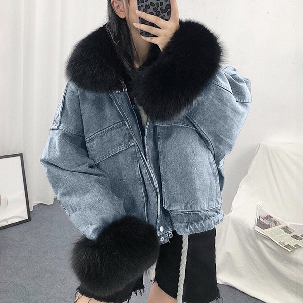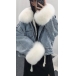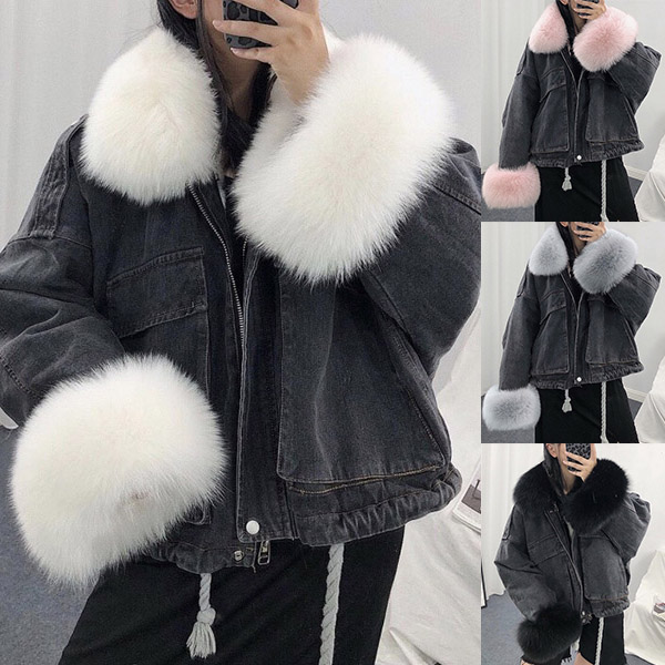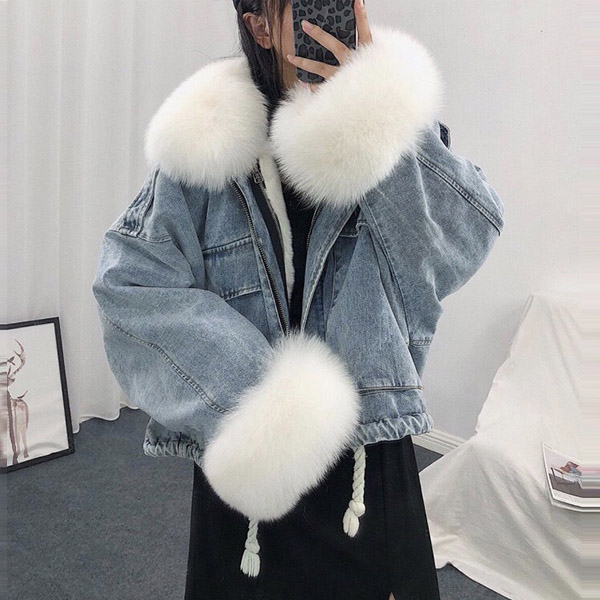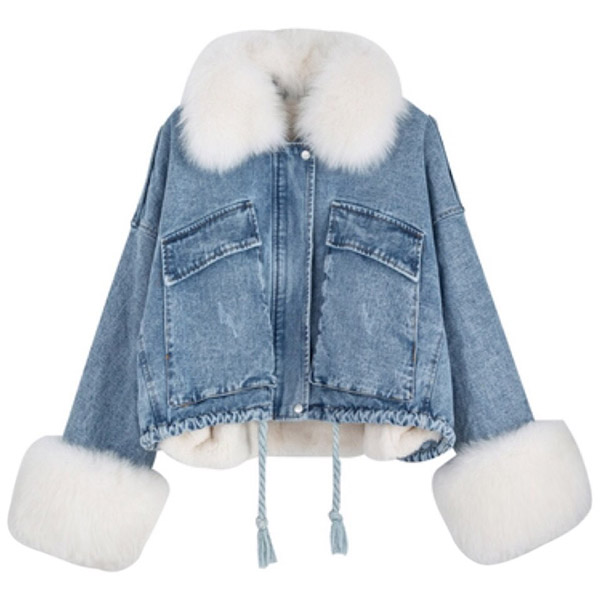 Fashion Detachable Faux Fur Collar Long Sleeve Plush Lining Denim Coat
