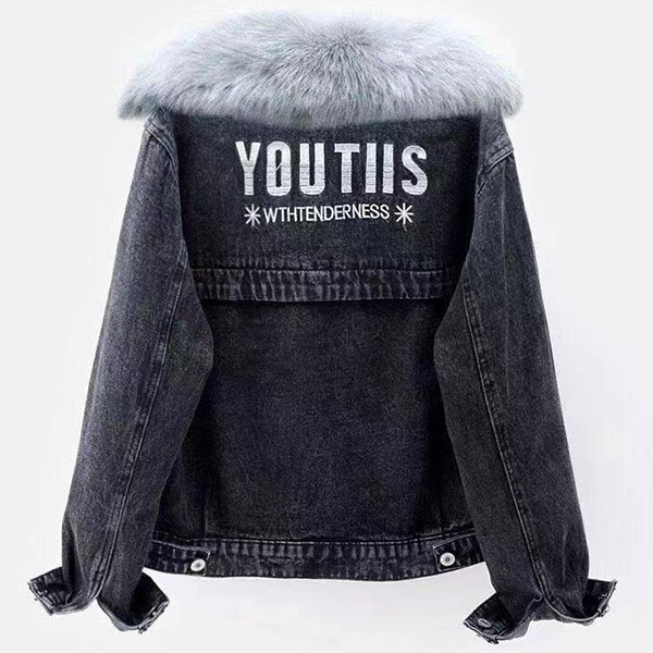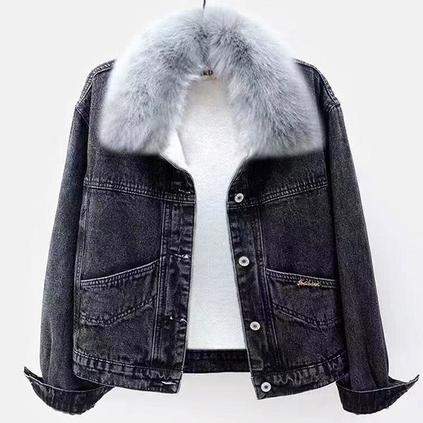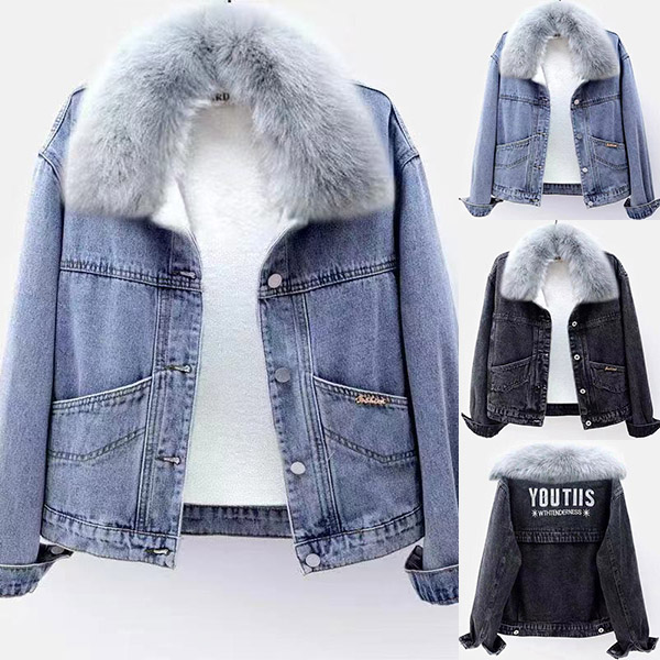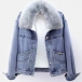 Fashion Detachable Faux Fur Collar Long Sleeve Plush Lining Denim Coat