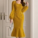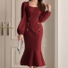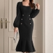 Fashion Diamond Pattern Double Breasted Square Neck Long Sleeve Fishtail Hemline Bodycon Dress