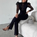 Fashion Diamond Pattern Gauze Spliced Puff Long Sleeve Sit Straight-cut Jumpsuit