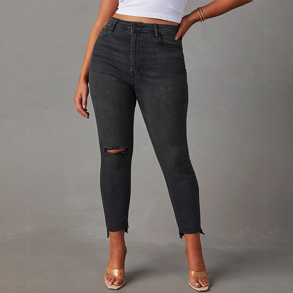 This is a trendy and edgy pair of jeans that combines a high-rise waist, distressed detailing, and a frayed hem for a stylish and fashionable look.
