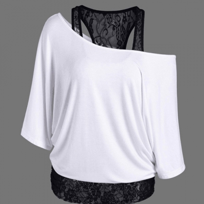 Fashion Dolman Sleeve Lace Spliced Mock Two-piece T-shirt